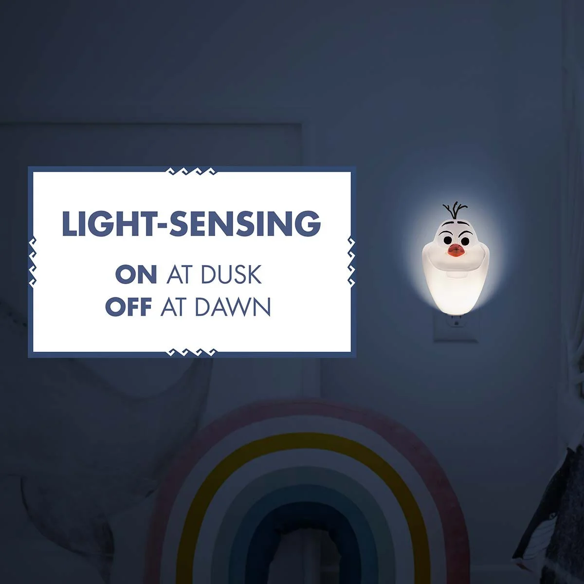 The smart design also allows the night light to conceal an entire outlet or use only the top receptacle to leave the second outlet free for continued use. Let your Frozen love shine with the Olaf Color-Select Night Light.