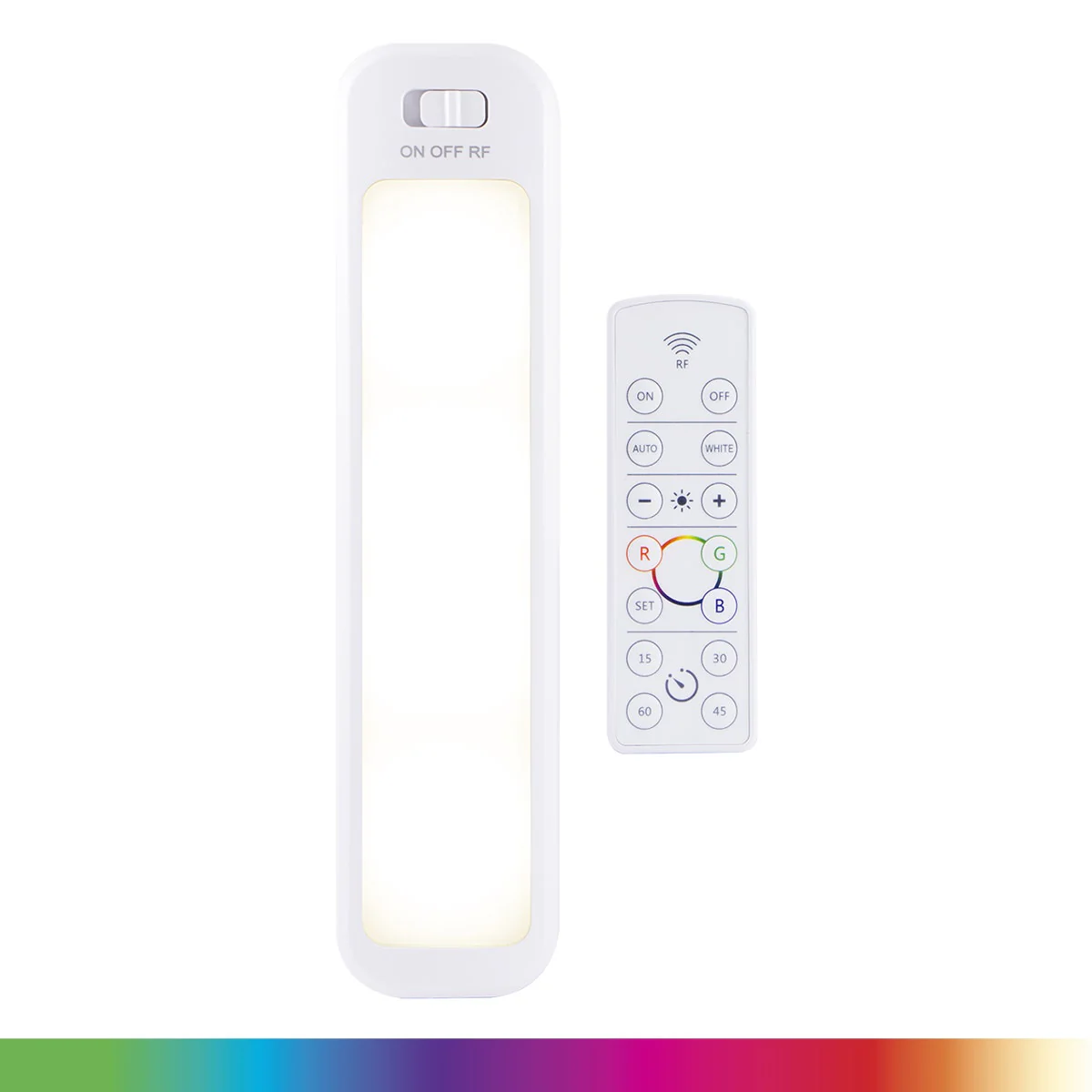 Control the colors of the rainbow with the GE 12in. Color-Changing Wireless Light Bar with Remote. The LED battery-powered light provides the full spectrum of color or bright, white light without wiring or plugging in the fixture. Activated by a manual ON/OFF switch or the included remote control, the light is perfect for kitchens, home bars, dens, children’s rooms, holidays, special occasions and any other time you need a versatile light source. The RF remote is powered by one CR2032 battery (included) and allows you to turn the light bar on and off, select custom colors or white option, adjust brightness, save your favorite color setting and choose a fade feature to continuously cycle through a range of colors. A timer function turns the light off after 15, 30, 45 or 60 minutes to conserve battery life. Installing the light is simple using the included hardware or double-sided mounting tape. Powered by six AA batteries, long-lasting LEDs illuminate any dry, indoor location with ease. See your space in color with the GE-branded 12in. Color-Changing Wireless Light Bar with Remote.