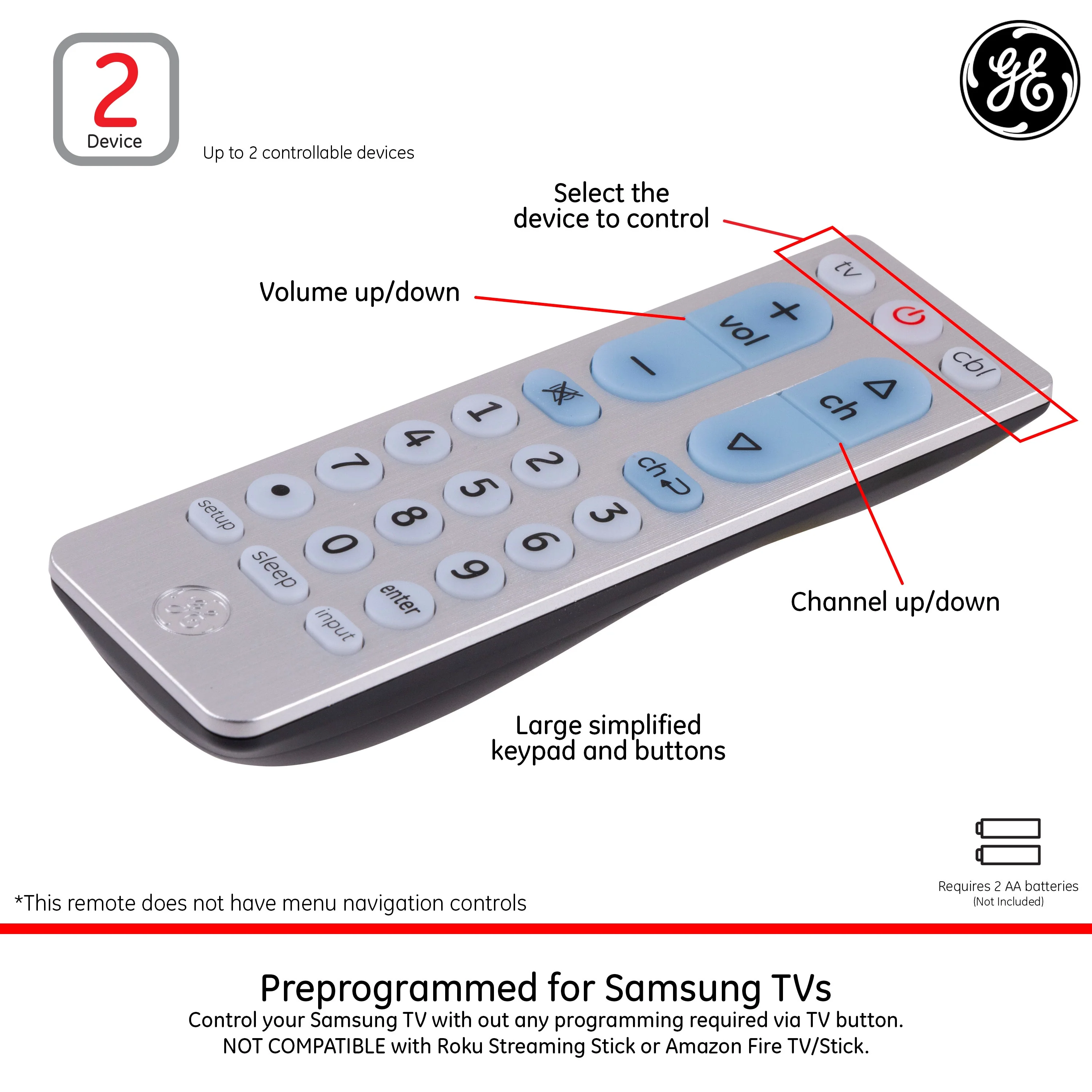 Consolidate control with a GE-branded UltraPro 2-Device Universal Remote in a brushed silver finish. No more worries about keeping track of multiple controllers. This universal TV remote is designed to control up to two devices, including your TV, soundbar, cable box, satellite receiver or other compatible device. Its large buttons are easy to read, and the simplified keypad makes it easy to navigate. Eliminate the hassle of managing more than one remote and enjoy having full control at your fingertips.